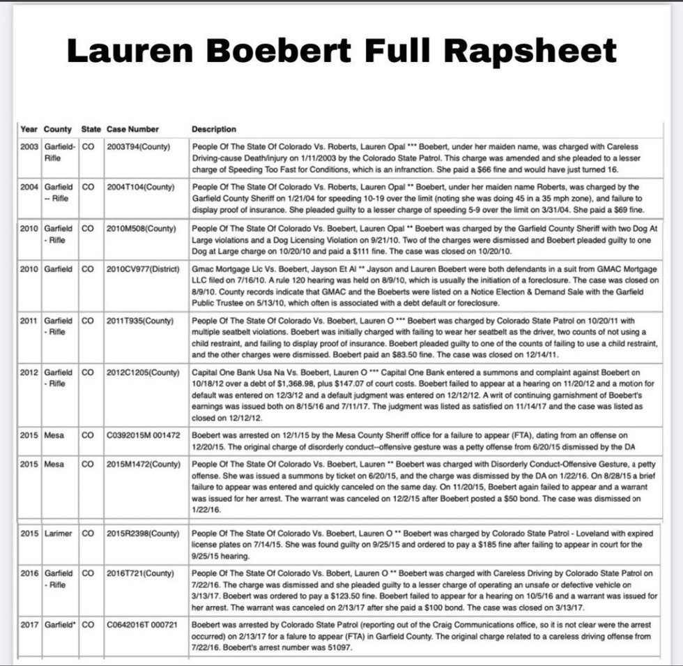 This is a long list of just some of @laurenboebert's arrests...the ones we know of. This is all public record. https://t.co/kQsmqxmeMA