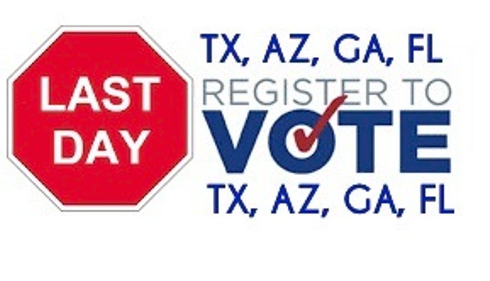 Tomorrow Oct. 5th is the last day to register in 4 critical states. TX,AZ,FL,GA. Register. Check your registration. Tell 4 others! You make the difference! We can keep the House, take the Senate, and win the Presidency. #Vote #Blue2020 #BidenHarris2020 https://t.co/eAchr1uxT0