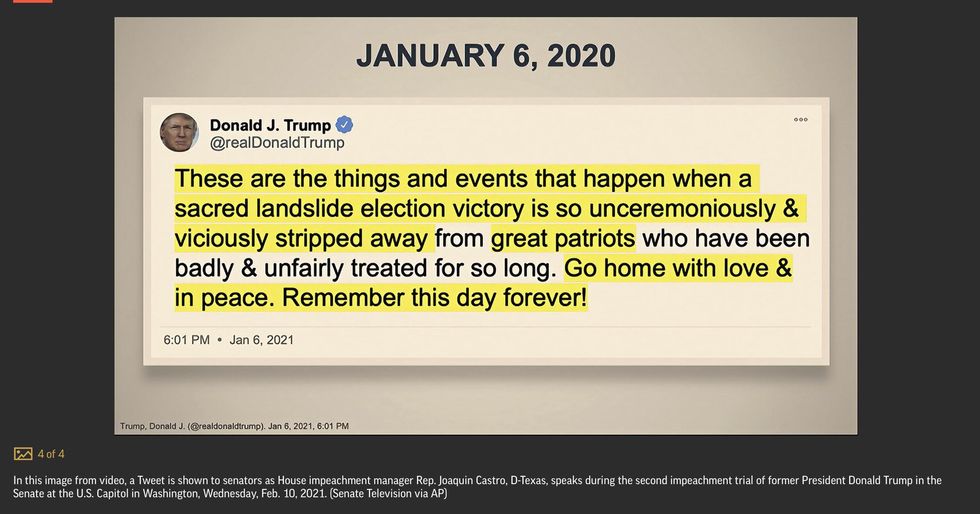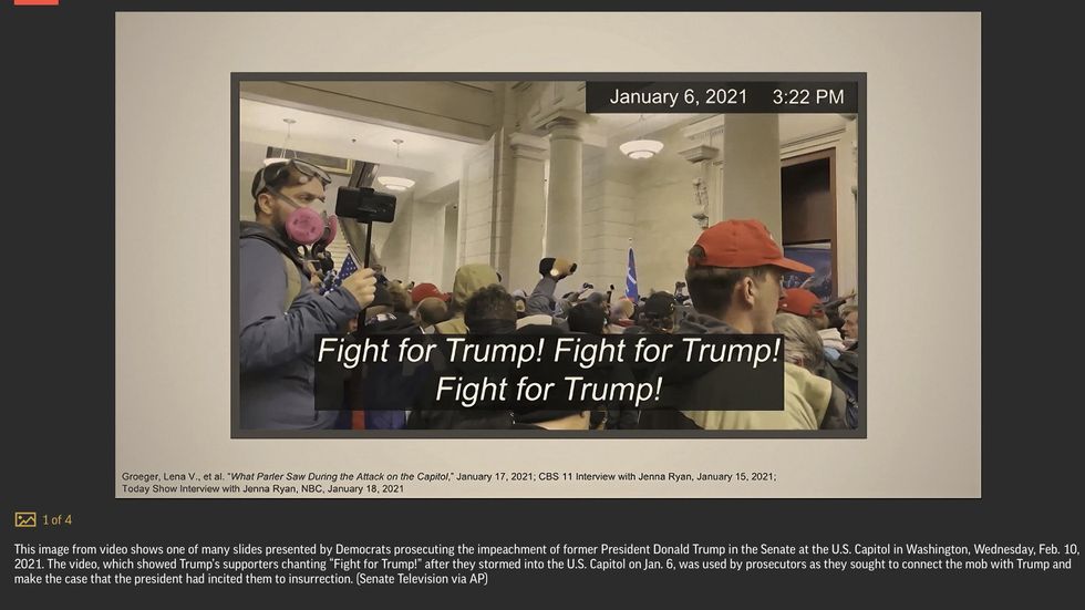 Trump's voice rang out in the Senate Chamber as Democrats aired video from his rallies and other remarks to supporters. Interspersed throughout were slides of Trump's tweets contesting the election and promoting the Jan. 6 rally in Washington, which he promised would be "wild."