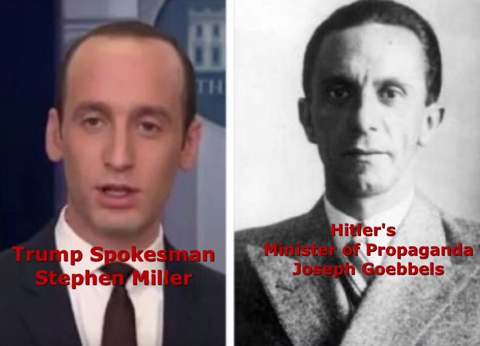 Addendum. All across the internet, people are calling attention to what they see as an amazing resemblance to Stephen Miller and Hitler's Minister of Propaganda Joseph Goebbels? What do you think? Is the physical resemblance what catches you or is it just the approach to law and language?