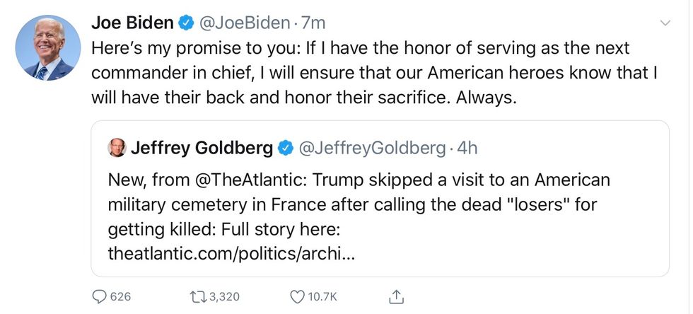Mr. Biden, the Democratic presidential nominee, sought on Thursday night to capitalize on the Atlantic article, quickly issuing a statement condemning the president and saying it demonstrated that Mr. Trump was not fit for the office. Mr. Biden said the article, if true, showed "another marker of how deeply President Trump and I disagree about the role of the president of the United States."