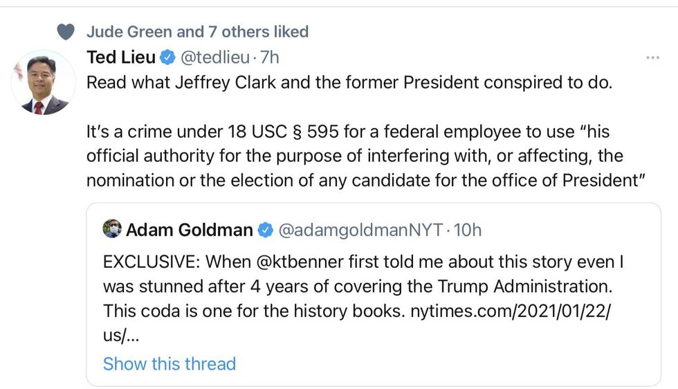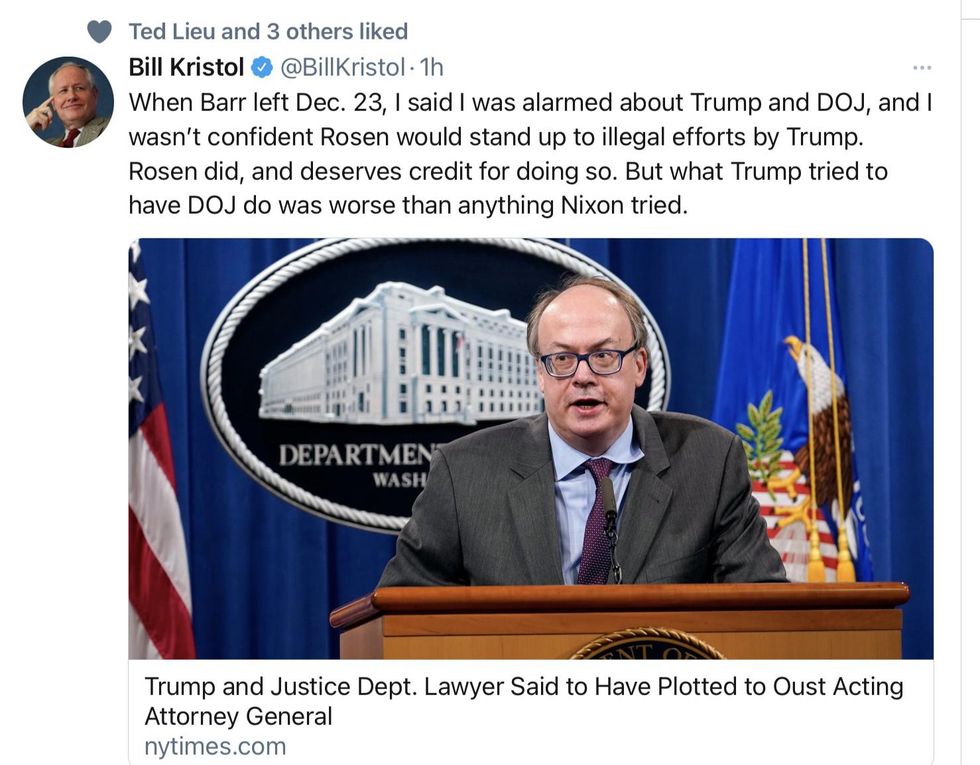 Voices4America Post Script. So, Trump first pressured the acting AG to press false claims on the Election, then he screwed around with a delusional member of the Justice Department to overturn the Election. This is the latest news. #TrumpCriminality #WorstThanNixon #RemoveTrump