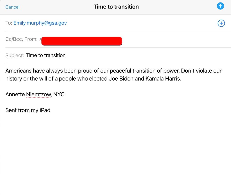Voices4America Post Script. "TransitionOfPower" is the hallmark of our Democracy. The Trump Admin is refusing to allow. Email and call #EmilyMurphy, the Trump appointee, who is threatening the Will of the People. Now that you read about it, email and call her. Share this!