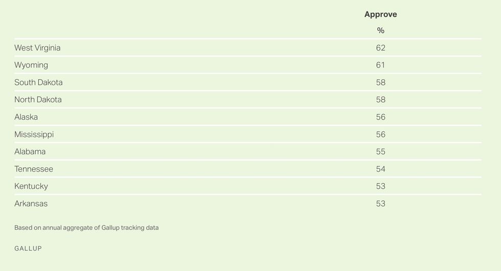 West Virginia (62%) and Wyoming (61%) residents were most approving of Trump's performance in 2018 and were the only two states with ratings above 60%. South Dakota, North Dakota, Alaska, Mississippi and Alabama had the next-highest approval ratings for Trump, with Tennessee, Kentucky and Arkansas constituting the remainder of the top 10. All but Mississippi ranked among the top 10 states in 2017.