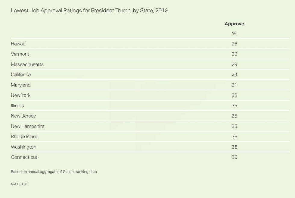 Trump's job approval ratings were lowest in Hawaii (26%) and Vermont (28%), with California and Massachusetts (each at 29%) also below 30%. The remainder of the bottom 10 includes Maryland, New York, Illinois, New Jersey and New Hampshire, with three states (Rhode Island, Connecticut and Washington) tied for 10th lowest.
