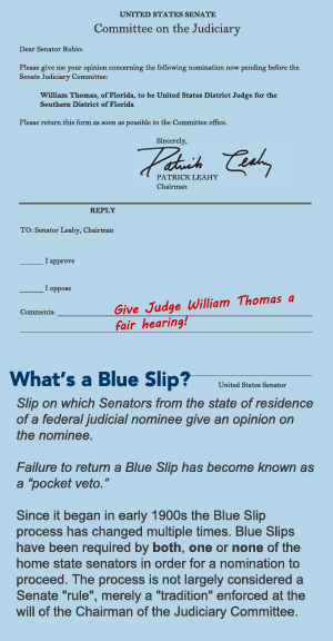 He cries that Democrats are obstructing his judicial nominations—"the Democrats are holding them up beyond anything. Beyond comprehension, they're holding them up," he said of "some of the most qualified people ever, and they're waiting forever on line—and that Senate Republicans should thus use their slim majority to scrap blue slips, the longstanding bipartisan tradition in which home state senators sign off on nominees, to speed his nominees through.