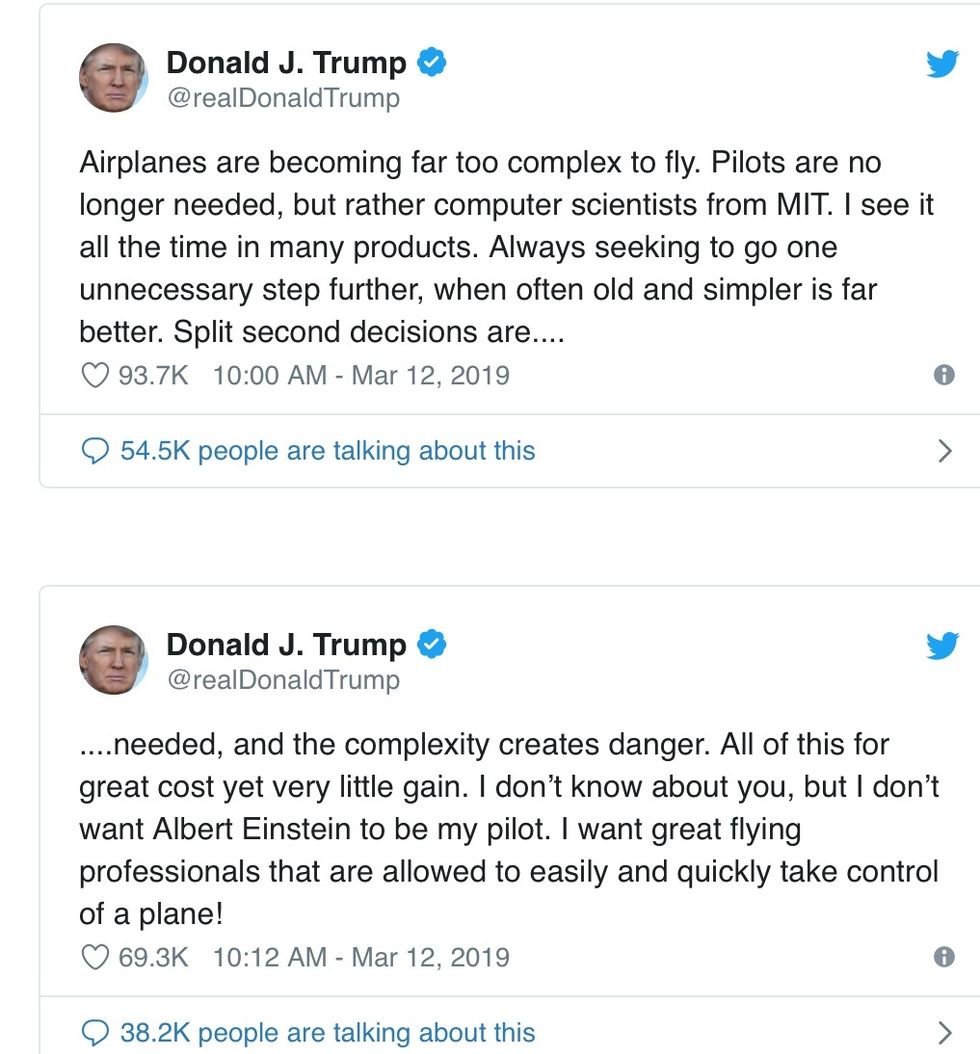 "Airplanes are becoming far too complex to fly," the president tweeted Tuesday morning. "Pilots are no longer needed, but rather computer scientists from MIT. I see it all the time in many products. Always seeking to go one unnecessary step further, when often old and simpler is far better. Split second decisions are … needed, and the complexity creates danger. All of this for great cost yet very little gain. I don't know about you, but I don't want Albert Einstein to be my pilot. I want great flying professionals that are allowed to easily and quickly take control of a plane!"