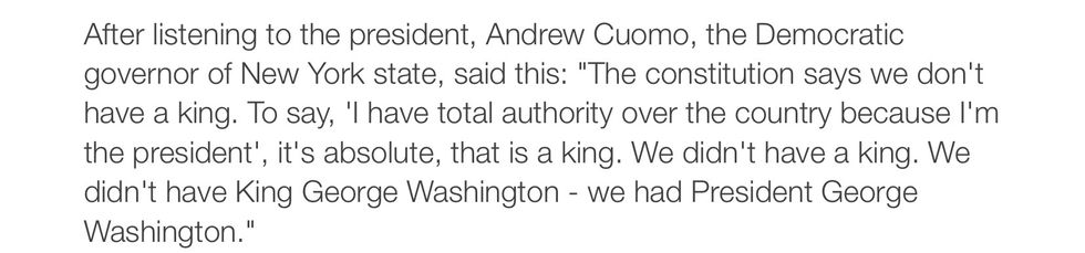 Fourth, it's hard to find something more un-American than Mr. Trump's statement — and the idea that lawyers at the revered Department of Justice and the White House, as well as members of the president's political party, have mostly stood silently by (and sometimes enabled) such legal views should give every American pause. The point here is not political: It's as likely that we will see a Democratic president next year as a Republican one. Would Republicans really want a world in which a Democratic president says he has "total" authority — for this Covid-19 crisis or for any other?