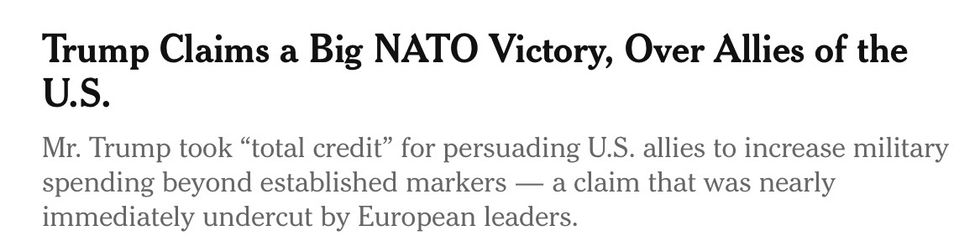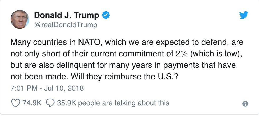 Trump, however, seems to falsely believe the U.S. is owed "reimbursements" from NATO members like Germany who don't yet spend 2 percent of GDP on defense.