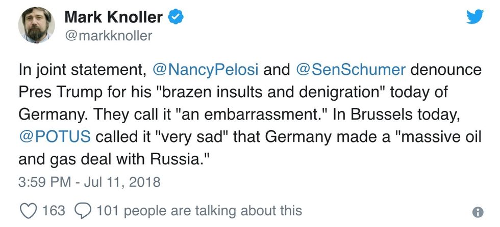 UPDATE (7/11, 10:00 a.m.) — Senate Minority Leader Chuck Schumer (D-NY) and House Minority Leader Nancy Pelosi (D-CA) released a joint statement denouncing Trump's attack on Germany.