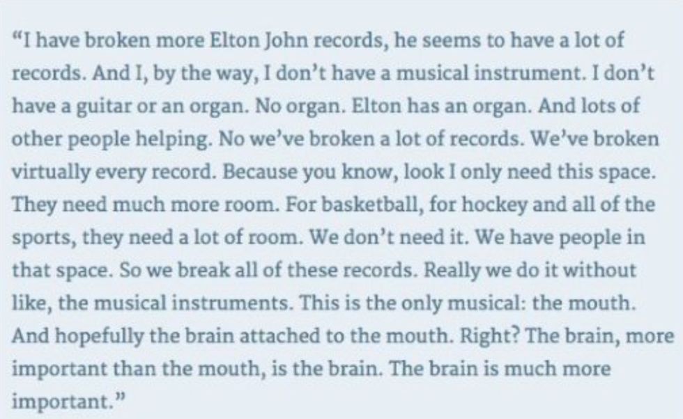 Finally, there was the bizarre. In the midst of criticizing Senator Elizabeth Warren, Trump—who has been caught on tape boasting about sexually assaulting women—paused to mock the #MeToo movement. Apropos of nothing, he puzzled over the meaning of George H.W. Bush's "Thousand Points of Light." He appeared (it was hard to follow the thread) to compare the size of his crowds to Elton John's: "I have broken more Elton John records...and I don't have a musical instrument. I don't have a guitar or an organ. No organ. Elton has an organ."