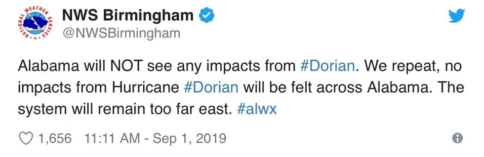 The National Weather Service said on Sunday, “Hurricane Dorian will not hit Alabama.”.