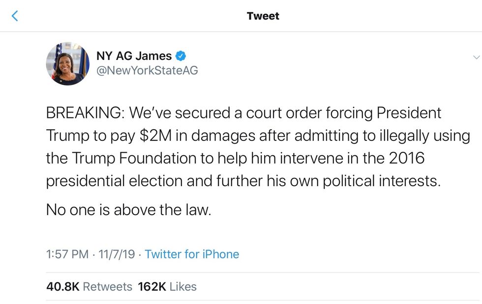 Ms. James hailed the court's decision and the resolution of the lawsuit as "a major victory" that would send a warning to "those who would abuse charities for personal gain." Mr. Trump, she said, had used the foundation as "a piggy bank to promote his political interests." She added: "No one is above the law — not a businessman, not a candidate for office, and not even the president of the United States."