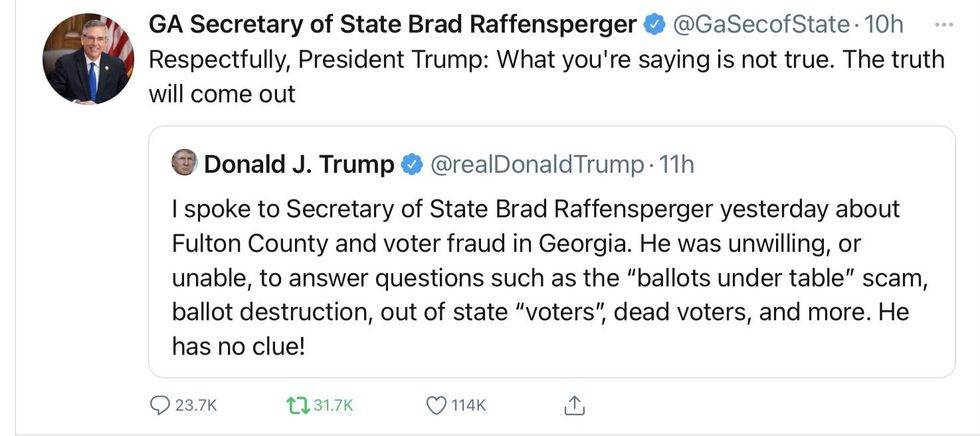 There are many many infractions and the bottom line is it's many many times the 11,779 margin that they said we lost by," Mr. Trump said at one point. "We had vast, I mean you have, the state is in turmoil over this and I know you would like to get to the bottom of it although I saw you on television today and you said that you found nothing wrong, I mean you know, and I didn't lose the state Brad. People have been saying that it was the highest vote ever. There was no way, a lot of the political people said that there is no way they beat me and they beat me."