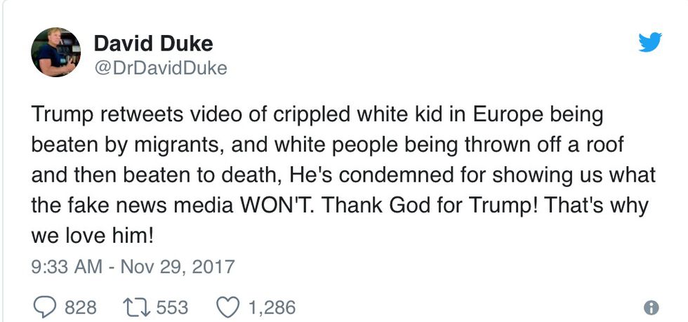 Mr. Trump's tweets were welcomed by a former Ku Klux Klan leader, David Duke, who wrote on Twitter: "Thank God for Trump! That's why we love him!"