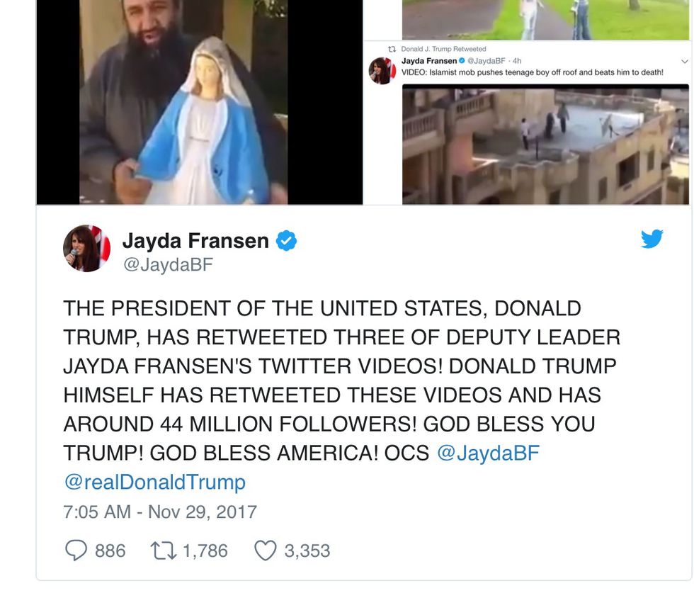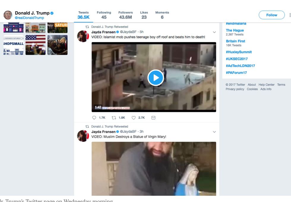 Mr. Trump retweeted the video posts from an ultranationalist British party leader, Jayda Fransen, who has been charged in the United Kingdom with "religious aggravated harassment." The videos were titled: "Muslim migrant beats up Dutch boy on crutches!" "Muslim Destroys a Statue of Virgin Mary!" and "Islamist mob pushes teenage boy off roof and beats him to death!"