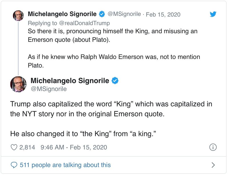 President Donald Trump gleefully quoted a New York Times article that had a headline calling the president "stained in history." But the important part for the president was not the headline, but the lead of the article that cited a Ralph Waldo Emerson quote about going after the "king." Even though the piece by Peter Baker was published two weeks ago, Trump quoted it on Twitter Saturday, with some eyebrow-raising changes.
