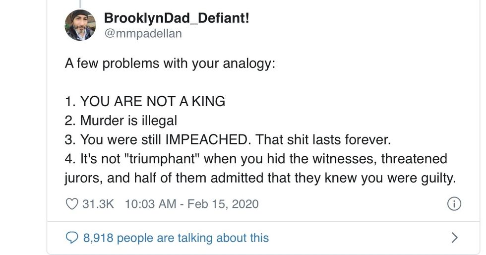 Legal experts were also quick to raise concerns about the president's tweets. "This may be the most sinister tweet Trump has ever posted," University of Michigan law professor Barbara McQuade wrote. "He is comparing himself with a king and threatening to use his powers for revenge on those who questioned his abuse of power." The president's quote came at the end of a week in which he said he had the "legal right" to interfere in criminal cases.