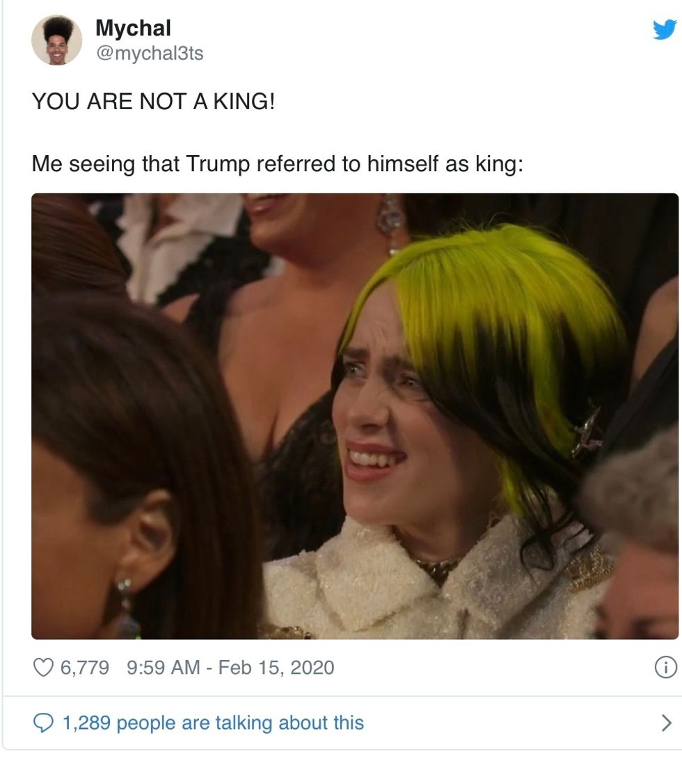 The president likening himself to a king quickly drew outrage and the phrase "you are not a king" started trending on Twitter. Many also expressed concern that Trump seemed to confirmhis campaign for re-election will be pushed by "grievance, persecution and resentment."