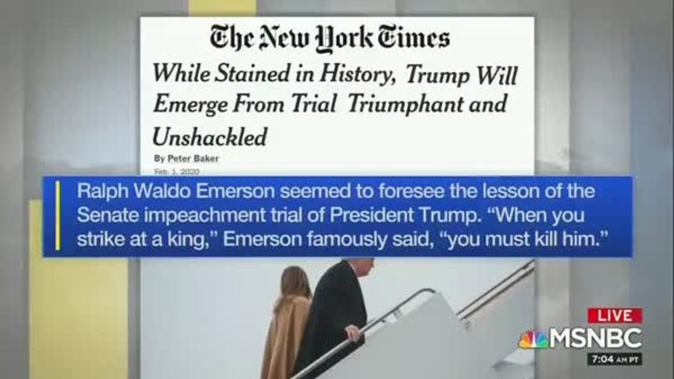 "Ralph Waldo Emerson seemed to foresee the lesson of the Senate impeachment trial of President Trump. 'When you strike at a king,' Emerson famously said, 'you must kill him,'" read the lead from Baker's Feb. 1 piece. "Mr. Trump's foes struck at him but did not take him down." Writing before senators voted to acquit Trump, Baker wrote that "a triumphant Mr. Trump emerges from the biggest test of his presidency emboldened, ready to claim exoneration and take his case of grievance, persecution and resentment to the campaign trail."