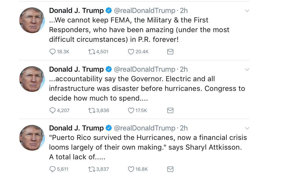 In a series of connected tweets this morning (October 12, 2017), Trump threatened to limit or discontinue aid to the island of Puerto Rico, devasted by Hurricane Maria on September 20. 3.5 million Americans live on the island.