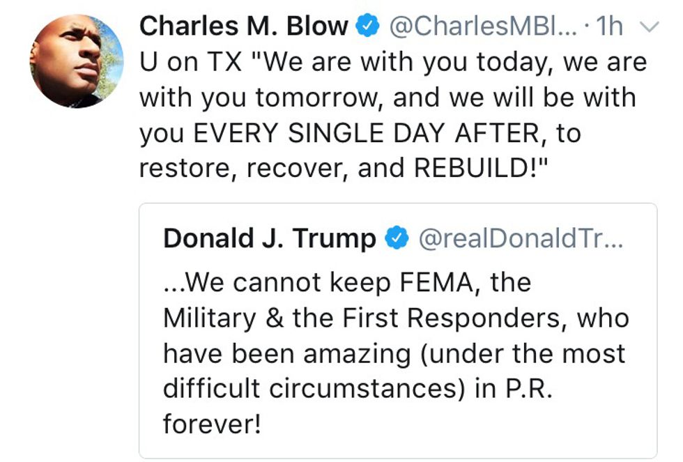 Charles Blow, New York Times columnist, tweeted this comparison of Trump on Houston and Trump on Puerto Rico: