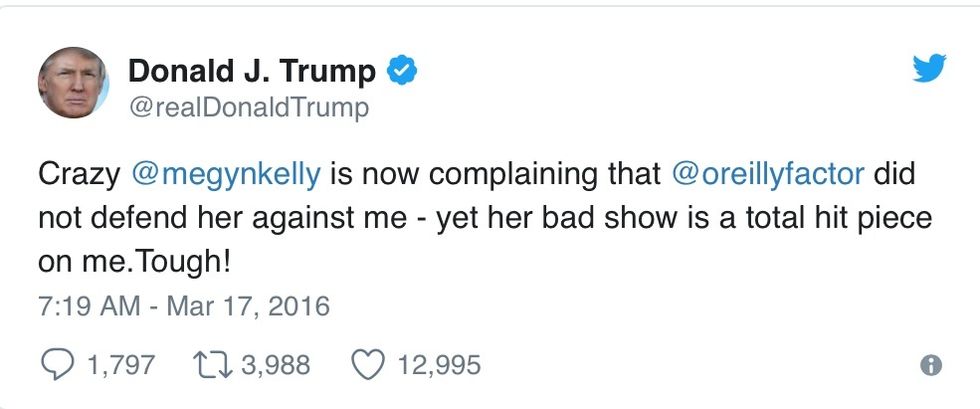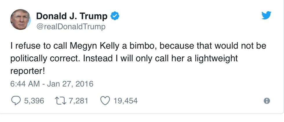 - Over 250 tweets target an individual journalist, and roughly 80 percent of these tweets were posted in the pre-primary and primary periods. The top target, by far, was Megyn Kelly, with some 60 references. Trump's feud with Kelly started at the first GOP debate and stretched through the general election. Joe Scarborough, who has repeatedly questioned Trump's mental health, has 15 references. From the primary period to today, he has been the most regular target.