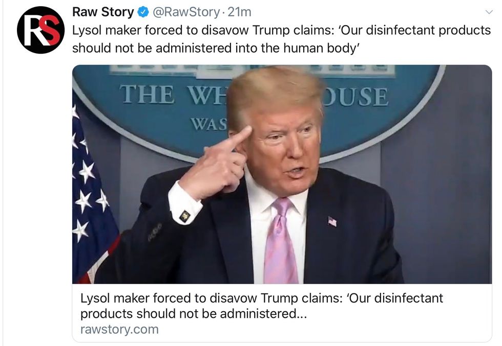 Appearing on the podium after Bryan, Trump openly wondered whether it would be possible to "hit the body with a tremendous" amount of light or have an "injection" of disinfectant as a way to kill the virus.
