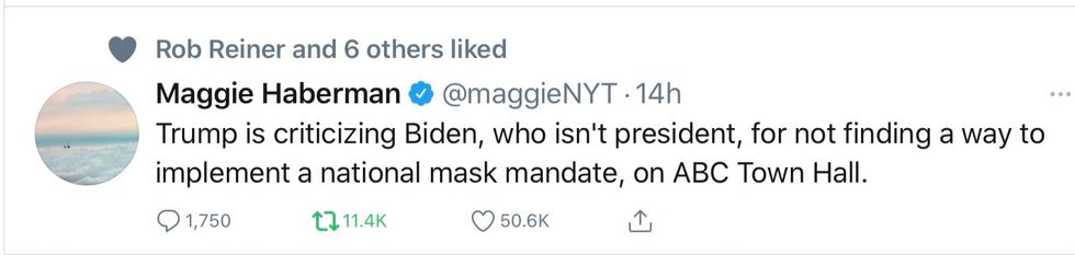 TRUMP: I'll tell you who those people are -- waiters. They come over and they serve you, and they have a mask. And I saw it the other day where they were serving me, and they're playing with the mask...I'm not blaming them...I'm just saying what happens. They're playing with the mask, so the mask is over, and they're touching it, and then they're touching the plate. That can't be good.