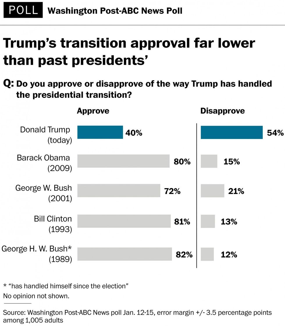 Just 40 percent approve of Trump's transition effort, compared with the 80-plus percent who approved of Obama's, Bill Clinton's and George H.W. Bush's. Fully 72 percent approved of George W. Bush's transition — still 32 points higher than Trump.In each case, even a clear majority of the other party approved of the transition — 62 percent for Obama, 57 percent for George W. Bush, 72 percent for Clinton and 71 percent for George H.W. Bush. Just 11 percent of Democrats approve of Trump's transition. Even among Republicans, approval for Trump's transition is substantially lower — 77 percent, vs. 87 percent or higher for each of his four immediate predecessors.