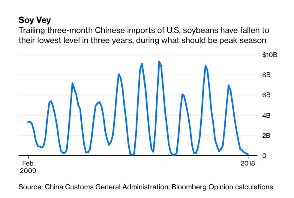 Although the U.S. runs a trade deficit with China, it still exports almost $200 billion a year to that country. Chinese tariffs hit American farmers hard, as the country halted most imports of soybeans from the U.S.:
