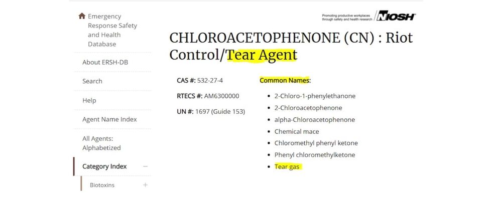 On that CDC Web page, chloroacetophenone is described as a "tear agent" for which one common name is "tear gas."
