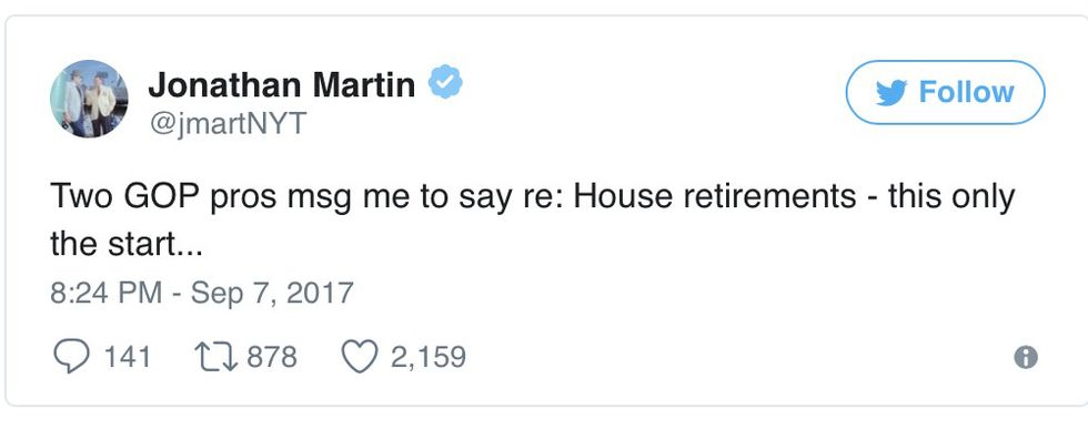 In a statement announcing his retirement, Dent referenced his growing isolation from the increasingly reactionary congressional GOP. "As a member of the governing wing of the Republican Party, I've worked to instill stability, certainty and predictability in Washington," Dent said. "I've fought to fulfill the basic functions of Government, like keeping the lights on and preventing default. Regrettably, that has not been easy given the disruptive outside influences that profit from increased polarization and ideological rigidity that leads to dysfunction, disorder and chaos."