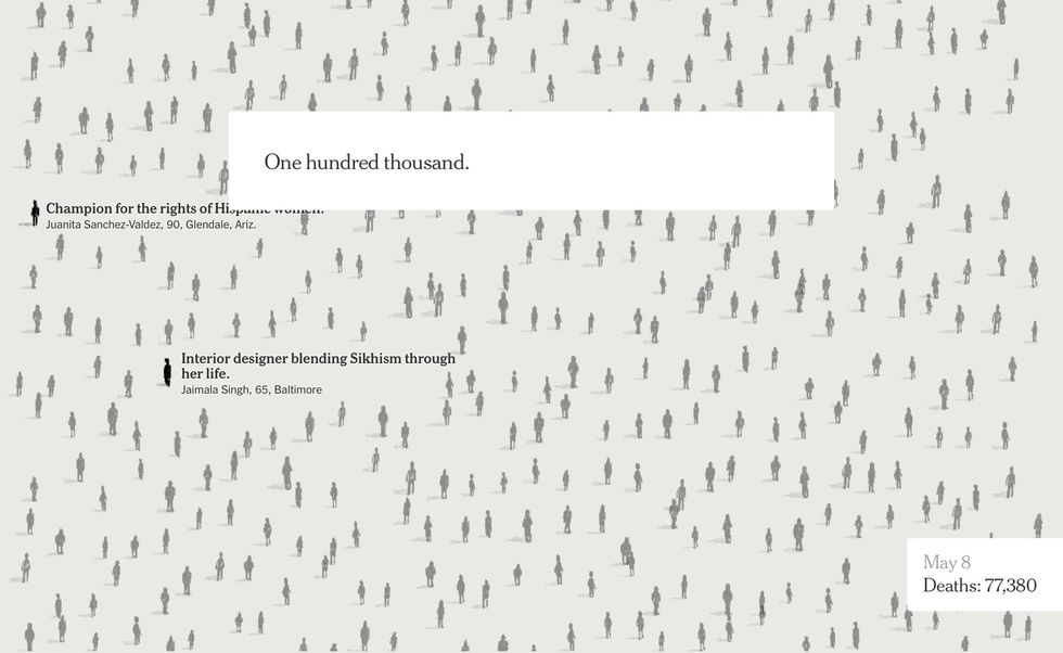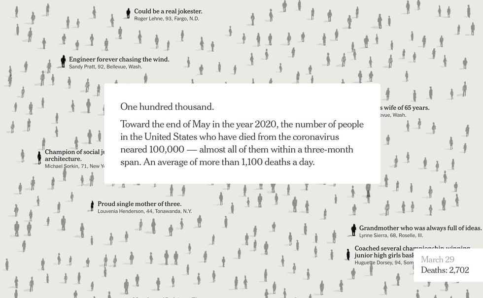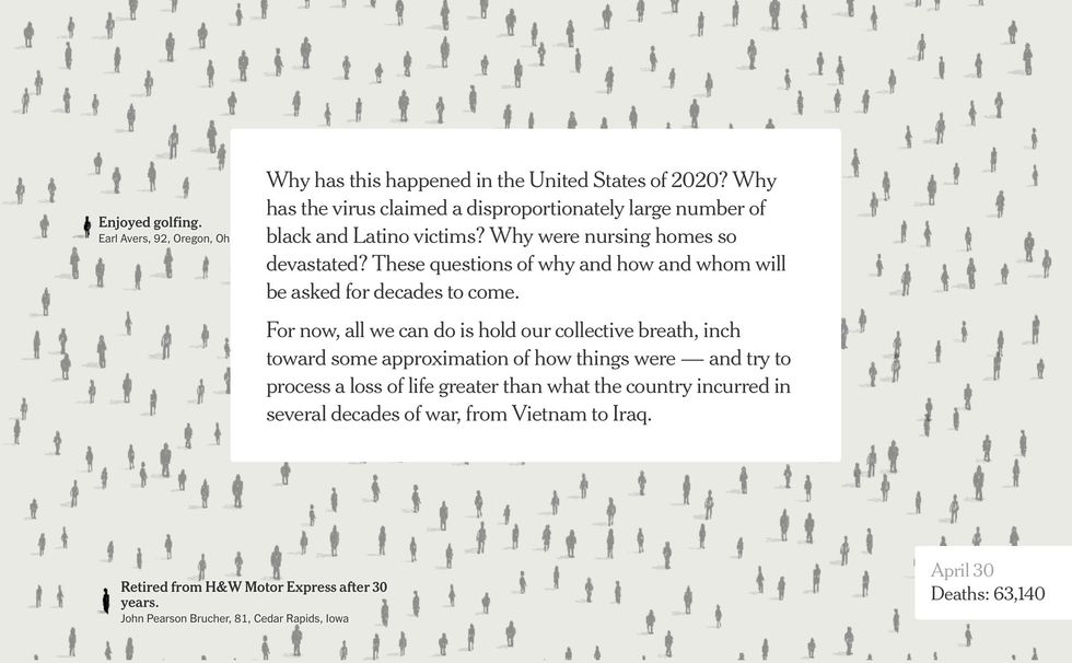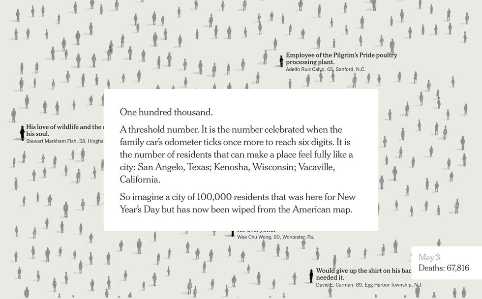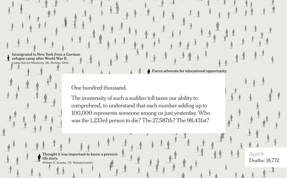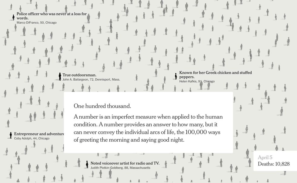 The digital version of the Times had 100,000 figures, with names culled from obituaries from across our devastated nation.