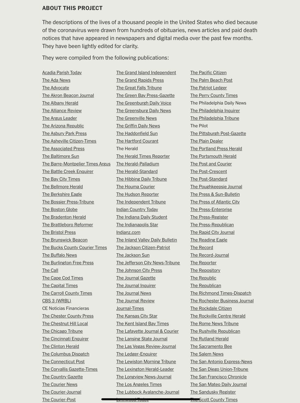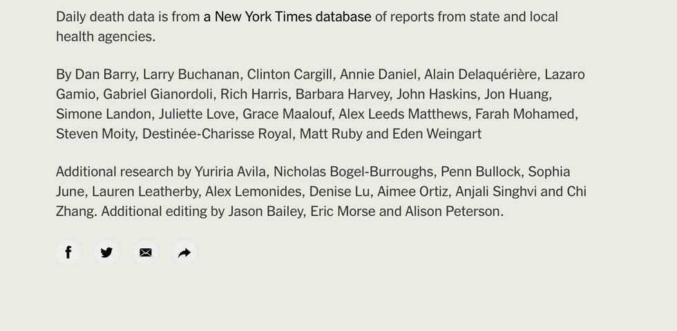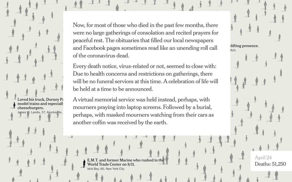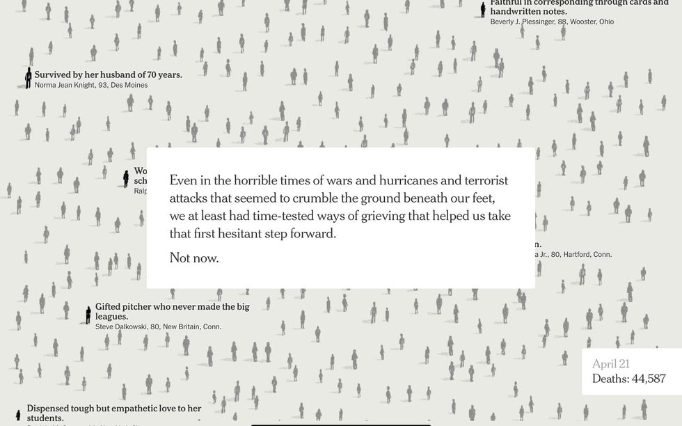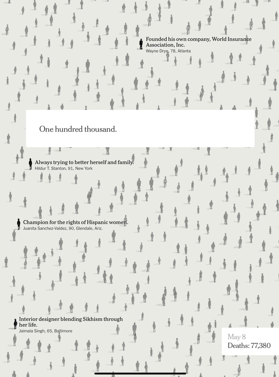 The digital version of the Times had 100,000 figures, with names culled from obituaries from across our devastated nation.