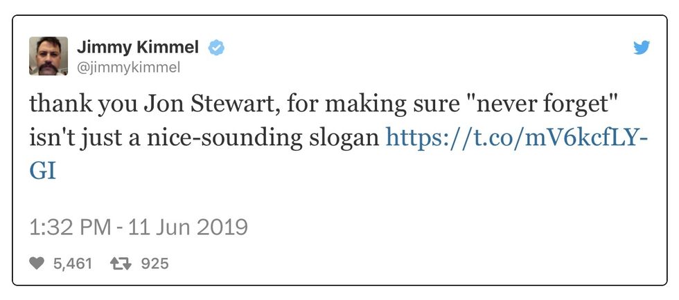 "There is not a person here — there is not an empty chair on that stage that didn't tweet out, 'never forget the heroes of 9/11; never forget their bravery; never forget what they did, what they gave to this country,'" Stewart said, then motioned to the crowd of first responders behind him. "Well, here they are."