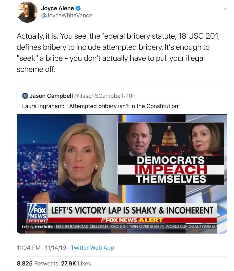 Pelosi’s use of the term “Bribery” used in the Constitution as cause to impeach and remove a President set off fireworks and a legal clarification too. Check this exchange on Twitter.
