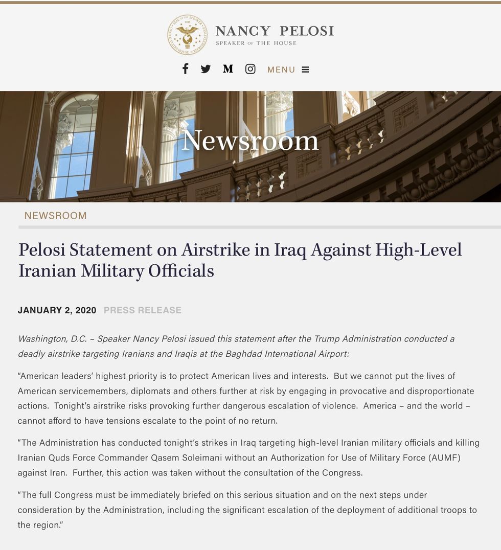 Pelosi Statement on Airstrike in Iraq Against High-Level Iranian Military Officials