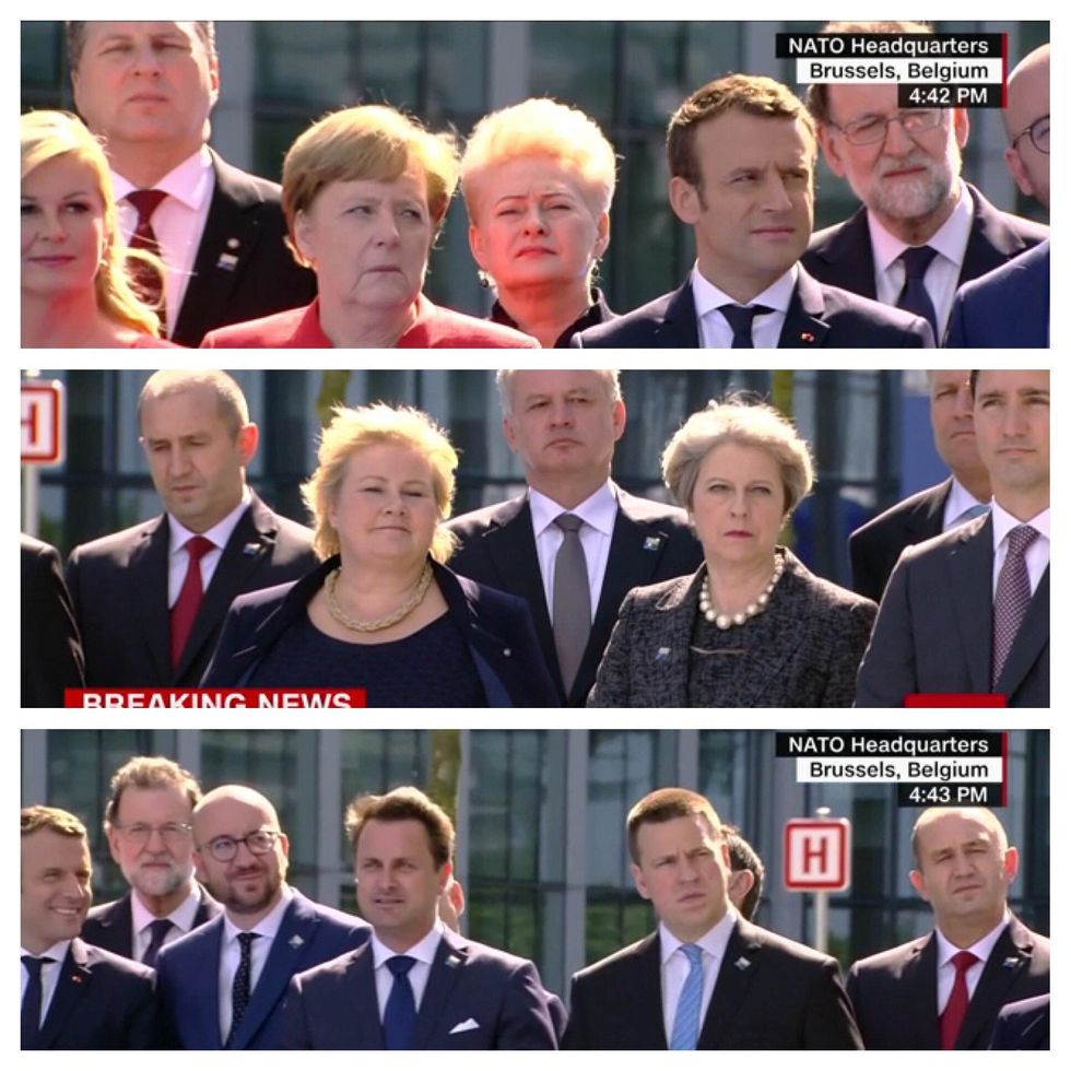 Speaking of shoulders, the U.S. president basically shoved the prime minister of Montenegro, the newest member of NATO, to get to the front of the group, because AMERICA FIRST: