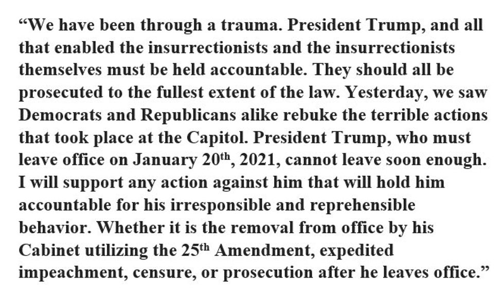 We have been through a trauma. President Trump and all that enabled the insurrectionists and the insurrectionists themselves must be held accountable. They should all be prosecuted to the fullest extent of the law....(see full statement below) https://t.co/z1tjIukPph