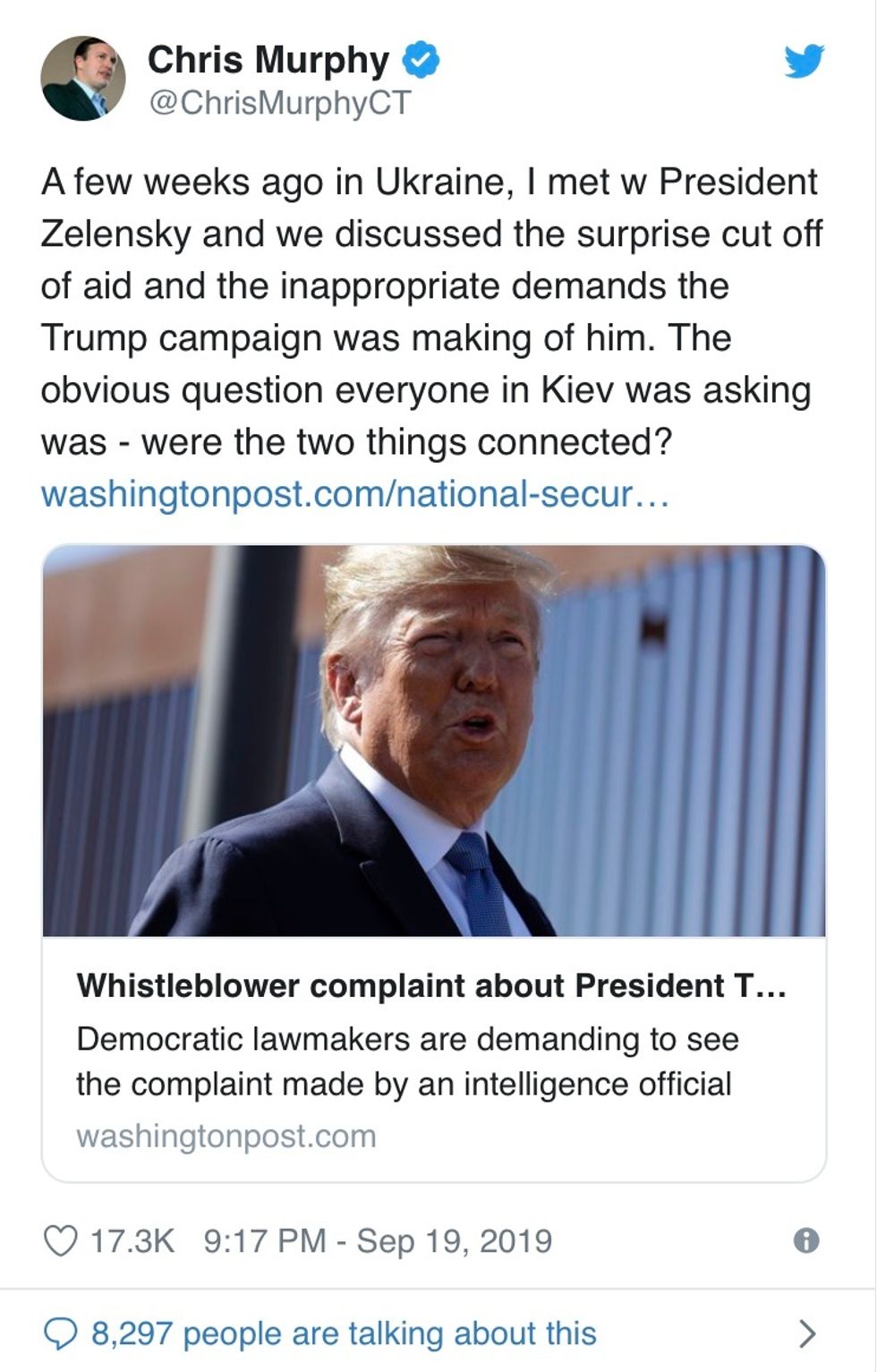 And that brings us to The Post's latest bombshell: "A whistleblower complaint about President Trump made by an intelligence official centers on Ukraine, according to two people familiar with the matter, which has set off a struggle between Congress and the executive branch." And it gets worse: