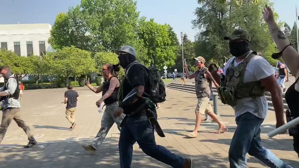 When Trump claims that BLM are "terrorists", here's a video from Oregon, where Trump Supporting "Proud Boys" are beating peaceful BLM protestors with baseball bats after charging at them: Please Share it! https://t.co/IwUUXwcWL4