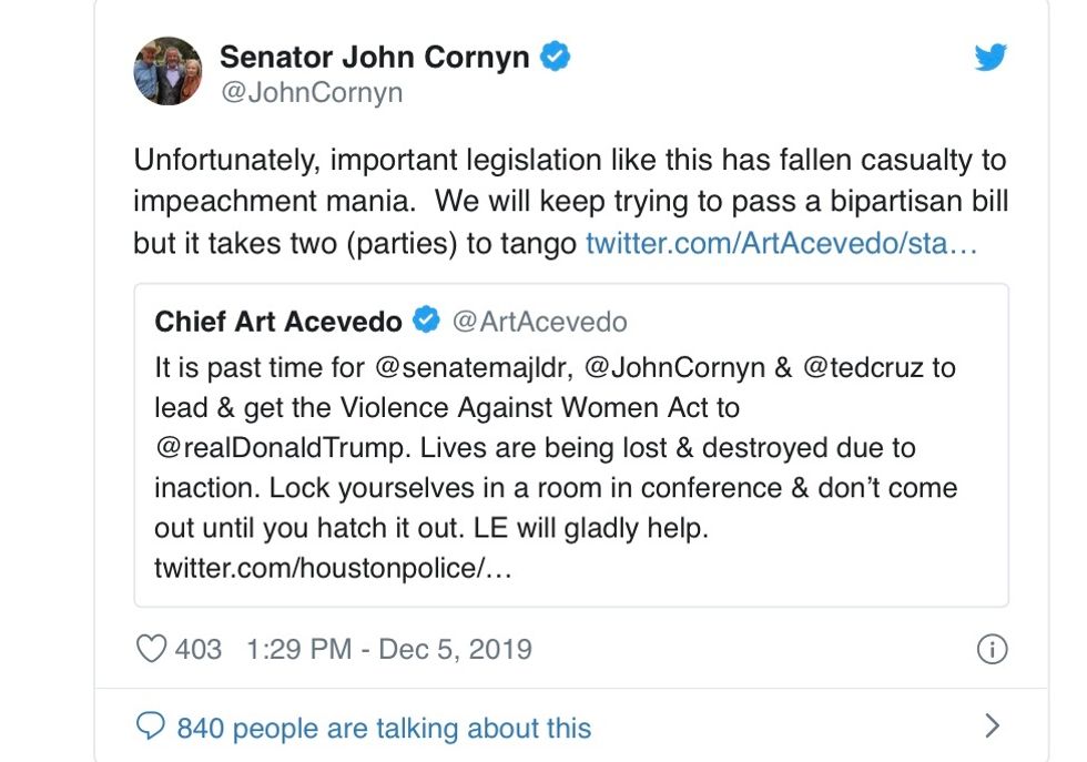 Cornyn fired back on Twitter: "Unfortunately, important legislation like this has fallen casualty to impeachment mania."