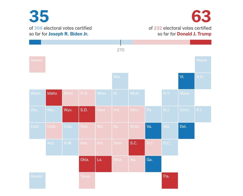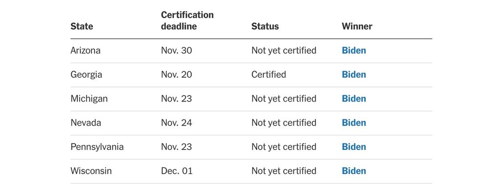 Below is a list of certification deadlines for the key battleground states that President-elect Joseph R. Biden Jr. won. The Trump campaign's strategy has been to try — so far unsuccessfully — to delay the certification processes in these states.