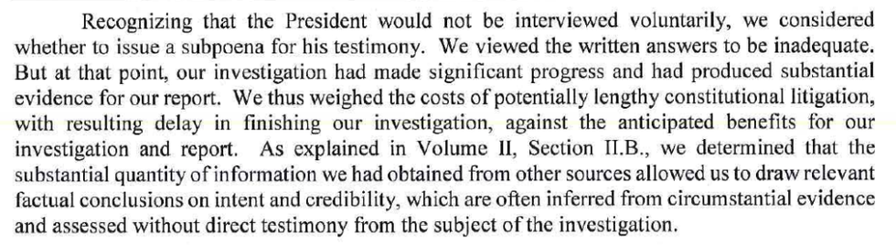 Following the submission of Trump's questions, there were questions of whether Mueller would issue a subpoena to have the president testify before a grand jury — but that never happened. The Mueller report explains why on pg. 418: It could have meant a protracted legal battle that would have delayed the investigation.