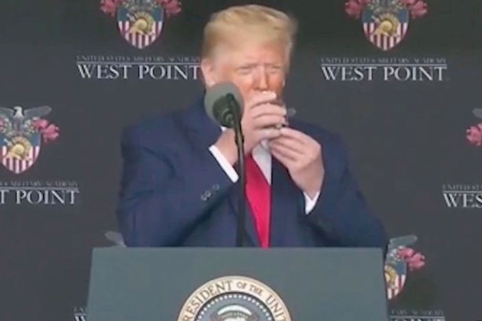 Yesterday Trump, who demanded West Point cadets return so he could address them, did that. He lied. Social media then saw him use his left hand help his right hand lift a glass of water, and struggle to walk down a ramp or was it stairs?# TrumpNotWell. https://t.co/in4IcSS9aS